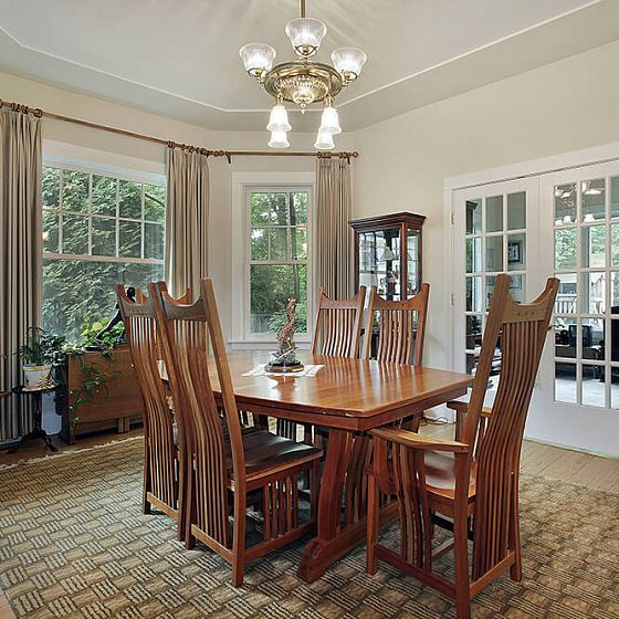 Мебель можно использовать искусственно состаренную, или перешедшую по наследству. Очень уместно в интерьере будут смотреться плетеные кресла и другая мебель из ротанга. Не лишним будет старинный открытый буфет с кувшинами и фаянсовой посудой. В оформлении мебели приветствуются кованные ажурные элементы, фамильные вензеля, резные ножки.
