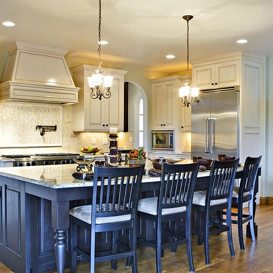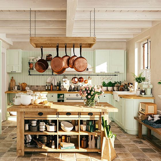 Потолки в комнатах с французским стилем обязательно украшаются деревянными балками или их качественной имитацией. На кухне к ним можно подвешивать сухоцветы, тканевые мешочки с пряными травами или даже кухонную утварь. Чтобы покрыть сам потолок, используется штукатурка или краска белого цвета.